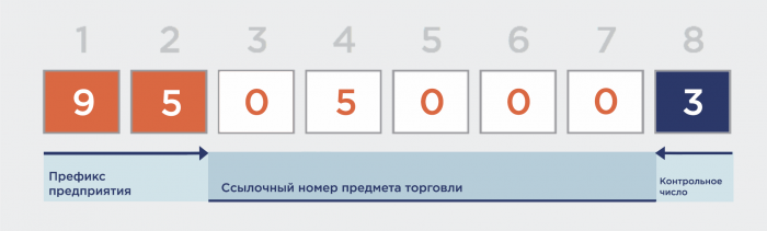 | Национальной организации – ГС1 РУС | Каждому отдельному виду продукции, независимо от кода предприятия, соответствует отдельный порядковый номер. Номера продукции различных предприятий идут вперемешку. Найти внутри номера GTIN-8 регистрационный номер предприятия нельзя. | Вычисляется из значений предыдущих 7 разрядов автоматически при формировании очередного номера GTIN-8. |