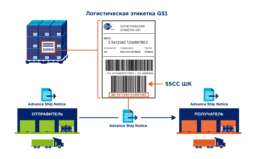 - Номер SSCC позволяет связать саму логистическую единицу и дополнительную информацию о ней. Эта информация может передаваться с помощью электронных сообщений Despatch Advice или Advanced Shipping Notice (ASN), прежде чем логистическая единица будет получена физически. По прибытии логистической единицы ее номер SSCC будет сканирован, что обеспечит получение требуемой информации и позволит ускорить приемку товаров, а также процедуру выставления счетов.